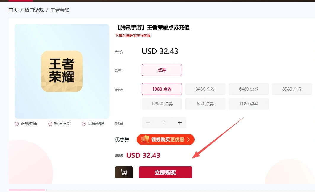 2、找到你想购买的产品,比如王者荣耀,选择好充值金额,点“立即购买”(温馨提示:购买前一定要领取优惠券哦):