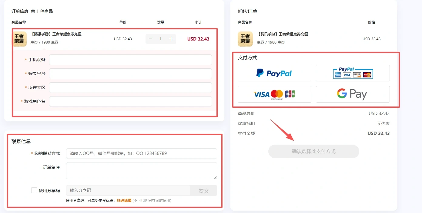 3、正确填写您的“手机设备”“登录平台”“所在大区”“游戏角色名”等等信息,还要留下你的联系方式,再选择你方便的支付方式,最后确认: