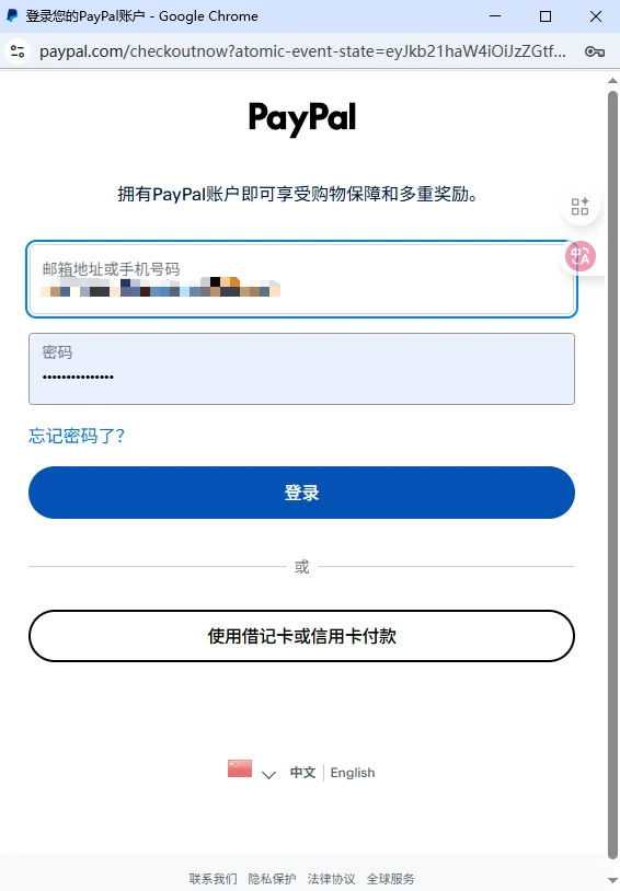 如选择PayPal支付,页面将弹出支付窗口展示订单金额明细,您可直接登录账户付款,或选择使用借记卡/信用卡完成支付。