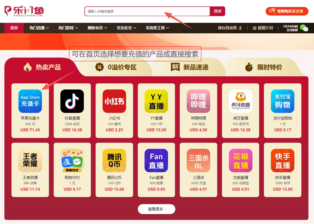 打开乐闪鱼payenjoynow官网,可以在首页专区直接找到“App Store充值卡”并点击进入,或通过搜索框直接搜索商品名称快速定位。