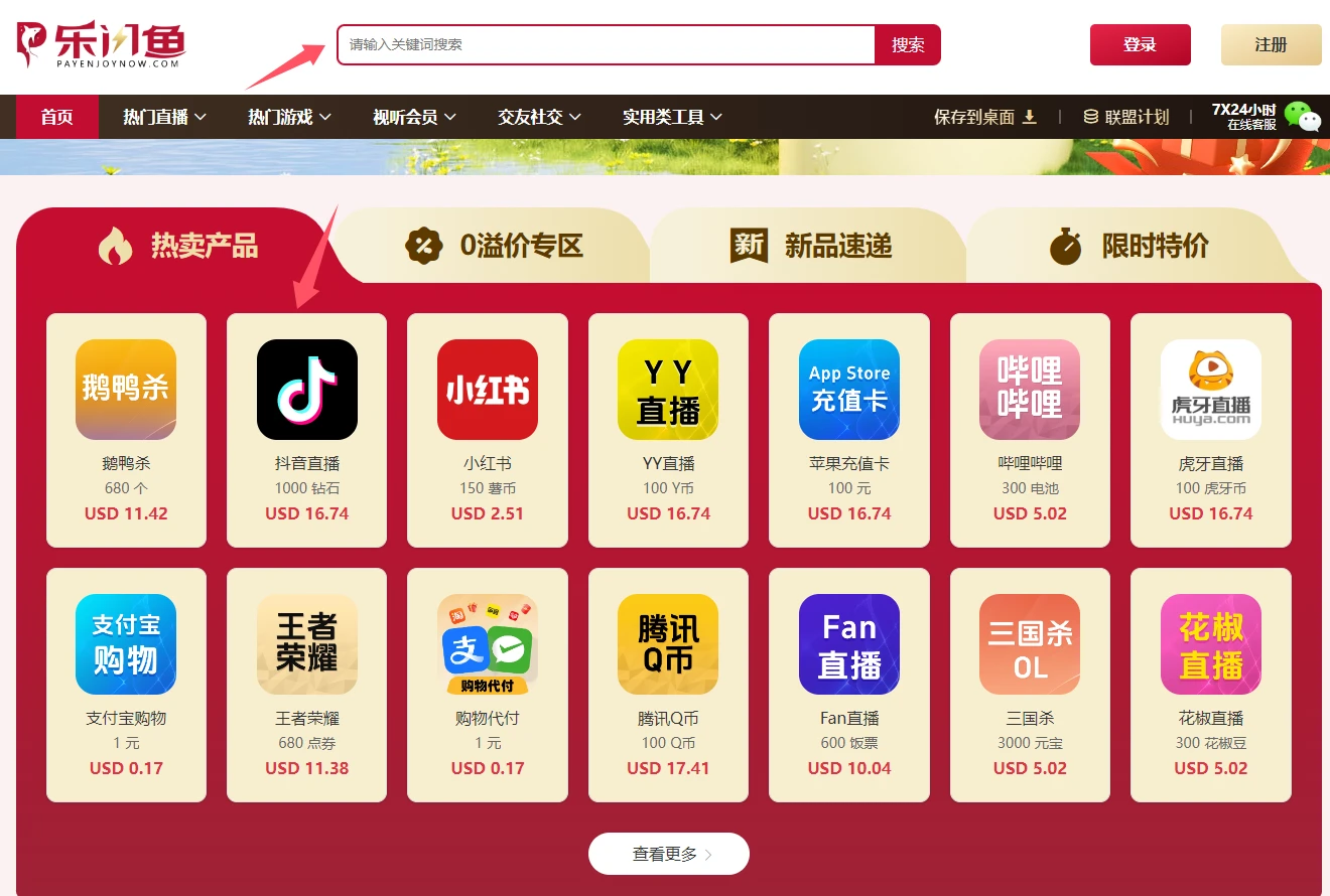可在首页下滑,在“热卖产品”中,找到【抖音直播】,点击进入充值页面;也可在上方搜索栏直接搜索名称或在【热门直播】分类中找到。